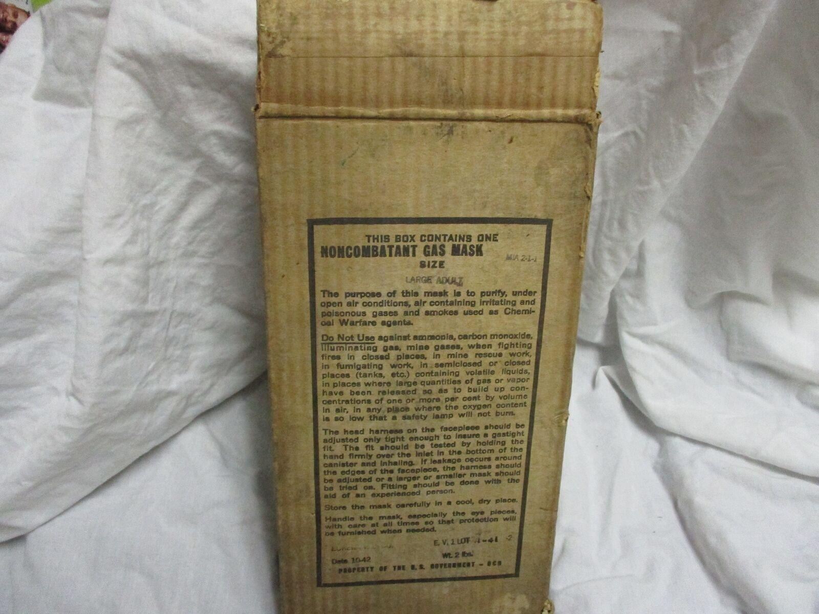 1942 Army Noncombatant Gas Mask WW2 MIA 2-1-1 Size Large With Carrying Bag. Everything Inside the factory box New old stock. The factory box is in poor condition. New old stock filter inside the factory box. Also comes with instructions but they looks aged.