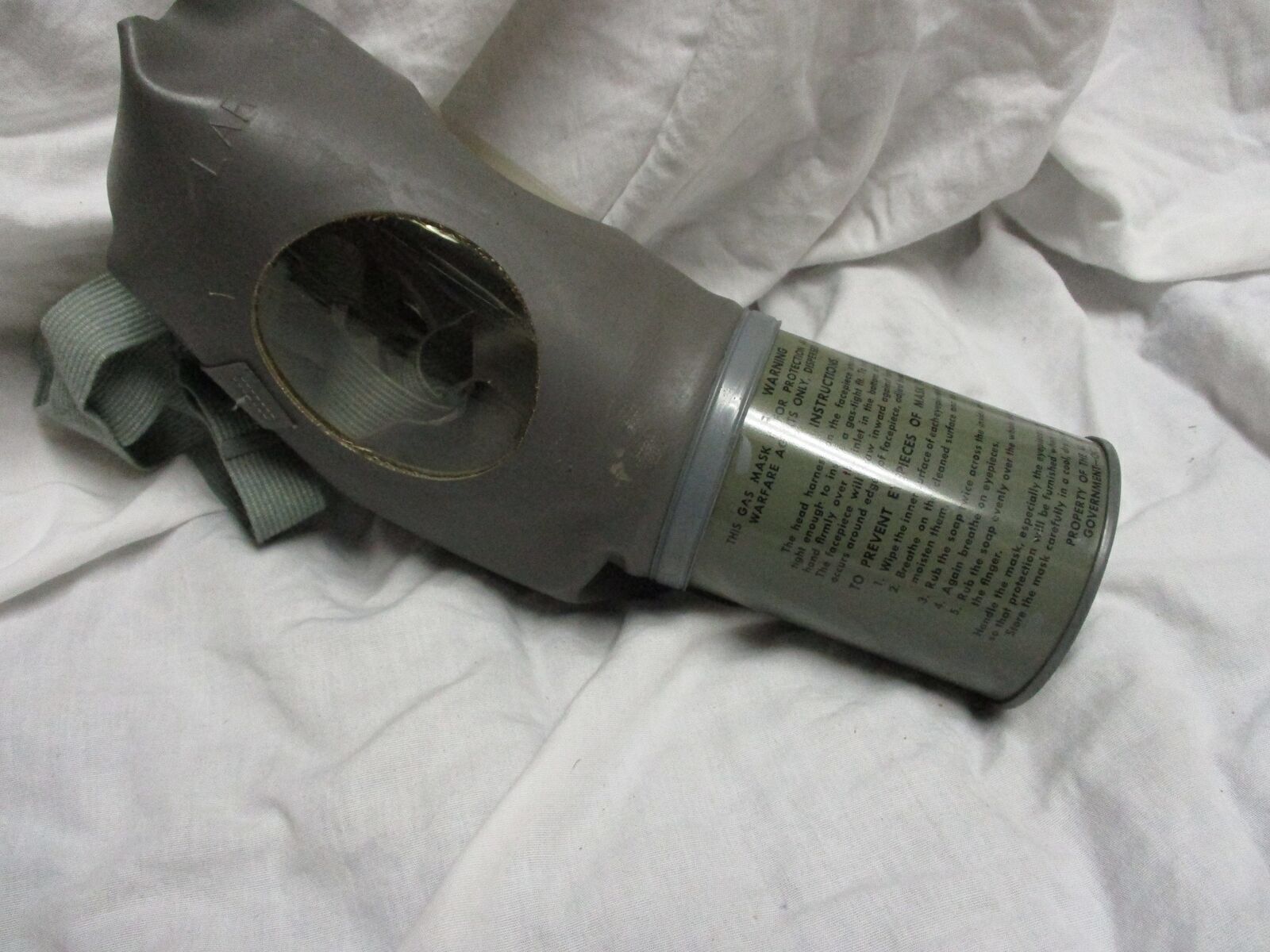A large adult size M2-2-1 noncombatant gas mask. Notice the large singular eyepiece instead of the two circular eyepieces like the larger sizes and the prominent exhale valve under the eyepiece.