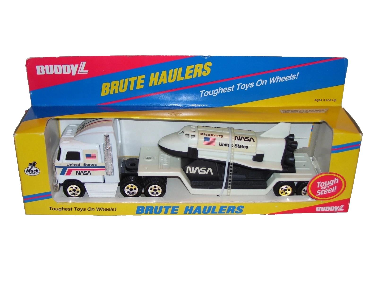 New in the original factory box but factory box not in the best condition.1989 Buddy L Brute Haulers NASA USA Toy Truck with Space Shuttle. Rare item.The 1989 Buddy L Brute Haulers NASA USA toy truck is a vintage diecast vehicle featuring a Mack truck design with a unique space shuttle attached to the rear. This toy truck appeals to both boys and girls who are interested in space exploration and collectible vehicles. The classic design and high-quality construction make it a sought-after collectible for enthusiasts of vintage toys and trucks.