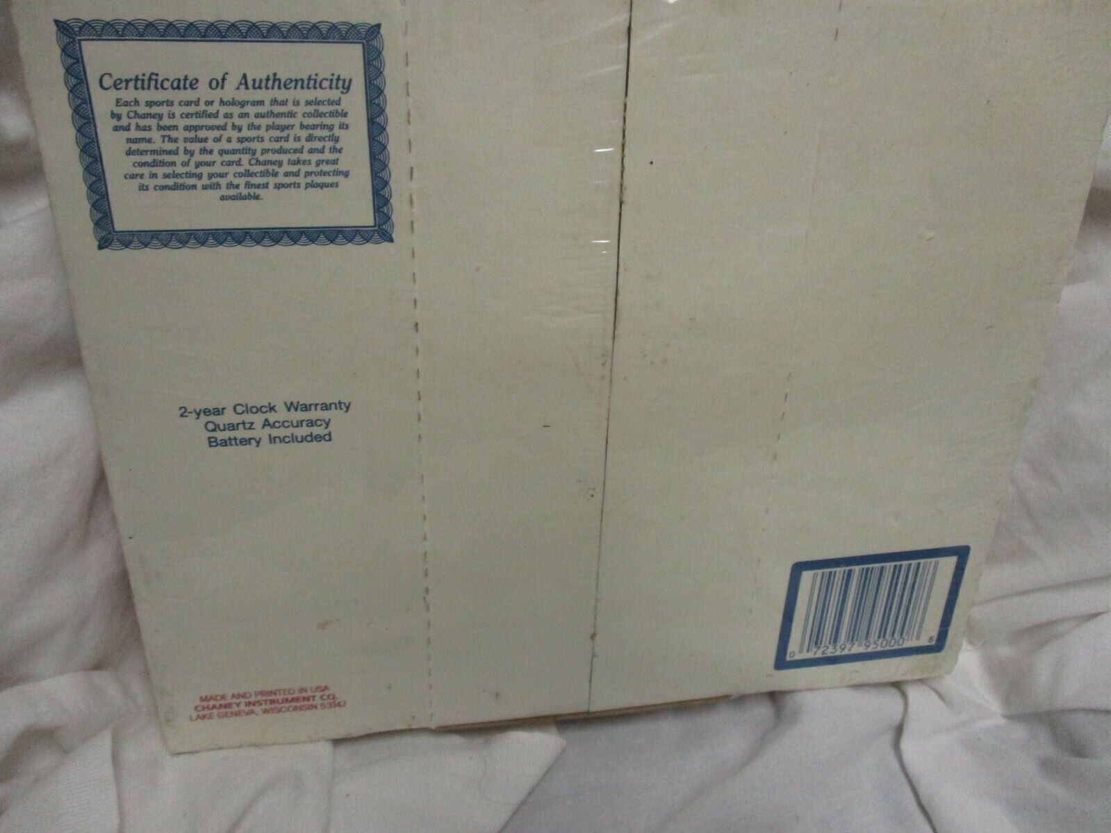 New old stock and factory sealed.The 1993 Michael Jordan Chaney Clock on Wood Wall Plaque is a unique collectible item that combines a clock with a picture of NBA legend Michael Jordan. The clock is mounted on a brown wooden wall plaque, adding a touch of elegance to any room. This vintage piece from the 1990s is perfect for adults who appreciate sports memorabilia and decorative collectibles. The hanging design makes it easy to display on a wall, serving as a stylish and functional addition to any space.