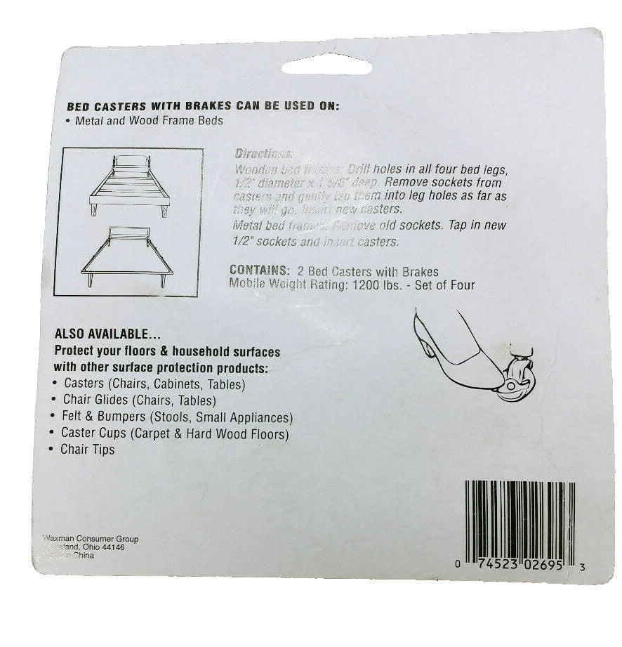 New in original factory package.2 1/4" Stem Bed Casters W/Brakes Waxman # 2695 Protect all Floors.The 2 1/4" Stem Bed Casters with Brakes by Waxman # 2695 are designed to protect all floors while providing easy mobility. Made in China, these durable casters are reliable for material handling in various industrial and business settings. The Waxman brand ensures quality and the built-in brakes offer safety and control for smooth operation.