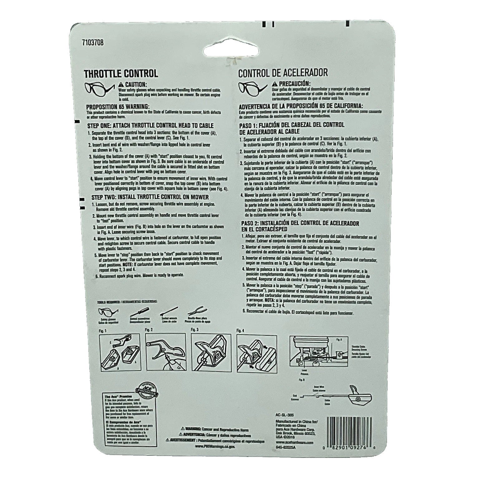 New in original factory box.ACE 7103708 Throttle Control T-knob with 48" Plastic Cable Control Universal.The ACE 7103708 Throttle Control T-knob with 48" Plastic Cable Control is a universal throttle cable designed for gas-powered lawn mowers. The sturdy plastic material ensures durability and longevity, making it a reliable choice for controlling the speed of your mower. The black color and compact design make it a seamless addition to your lawn care equipment, providing easy and precise control for a smooth and efficient mowing experience.