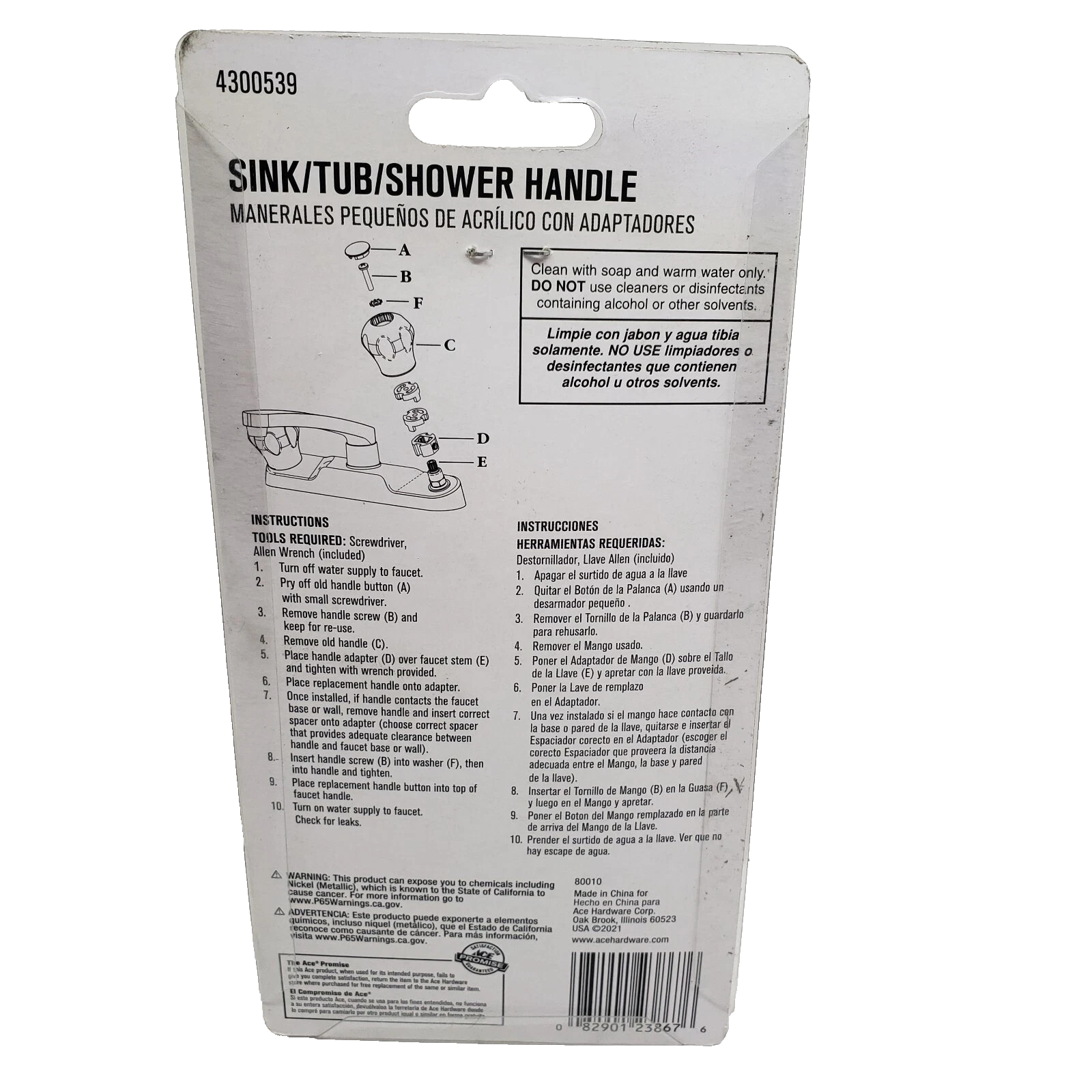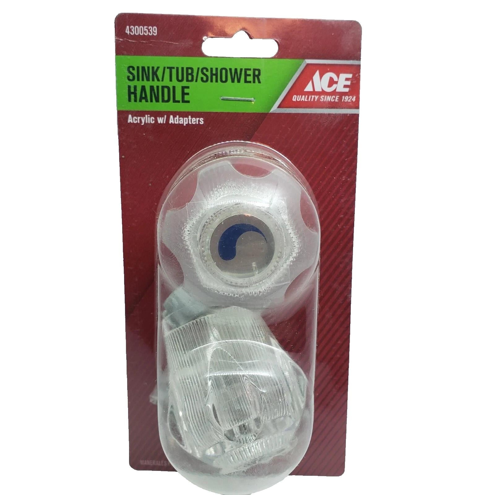 New in original factory package.ACE Acrylic Small Clear Universal Handles w/ Adapters (2) #4300539.The product is a set of two small clear universal sink handles by ACE, model number 4300539. These handles come with adapters for easy installation on various sink fixtures. The Ace brand ensures quality and reliability for your plumbing needs. Perfect for adding a stylish and functional touch to your kitchen or bathroom fixtures.