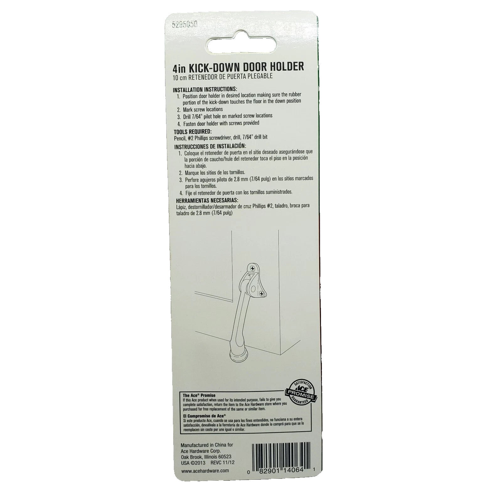 Factory sealed.The ACE Kick Down Door Holder in White is a modern and stylish door stay made of metal. It features a screw-in installation for easy setup and a door mount design for added convenience. With a sleek white color, this door holder from ACE adds a touch of elegance to any home décor while providing a practical solution for keeping doors open with ease. The package includes one door holder, perfect for adding a contemporary flair to your living space.