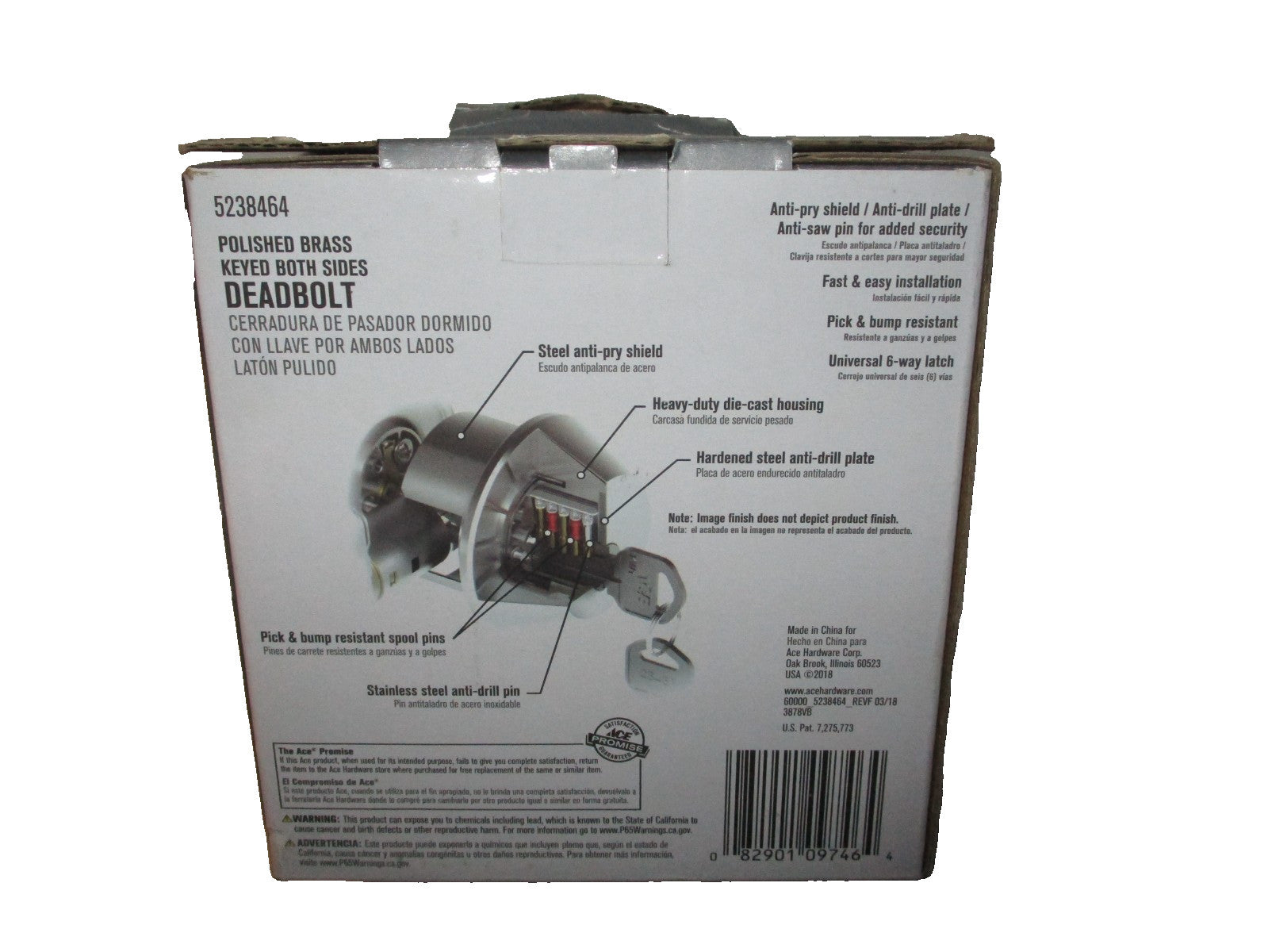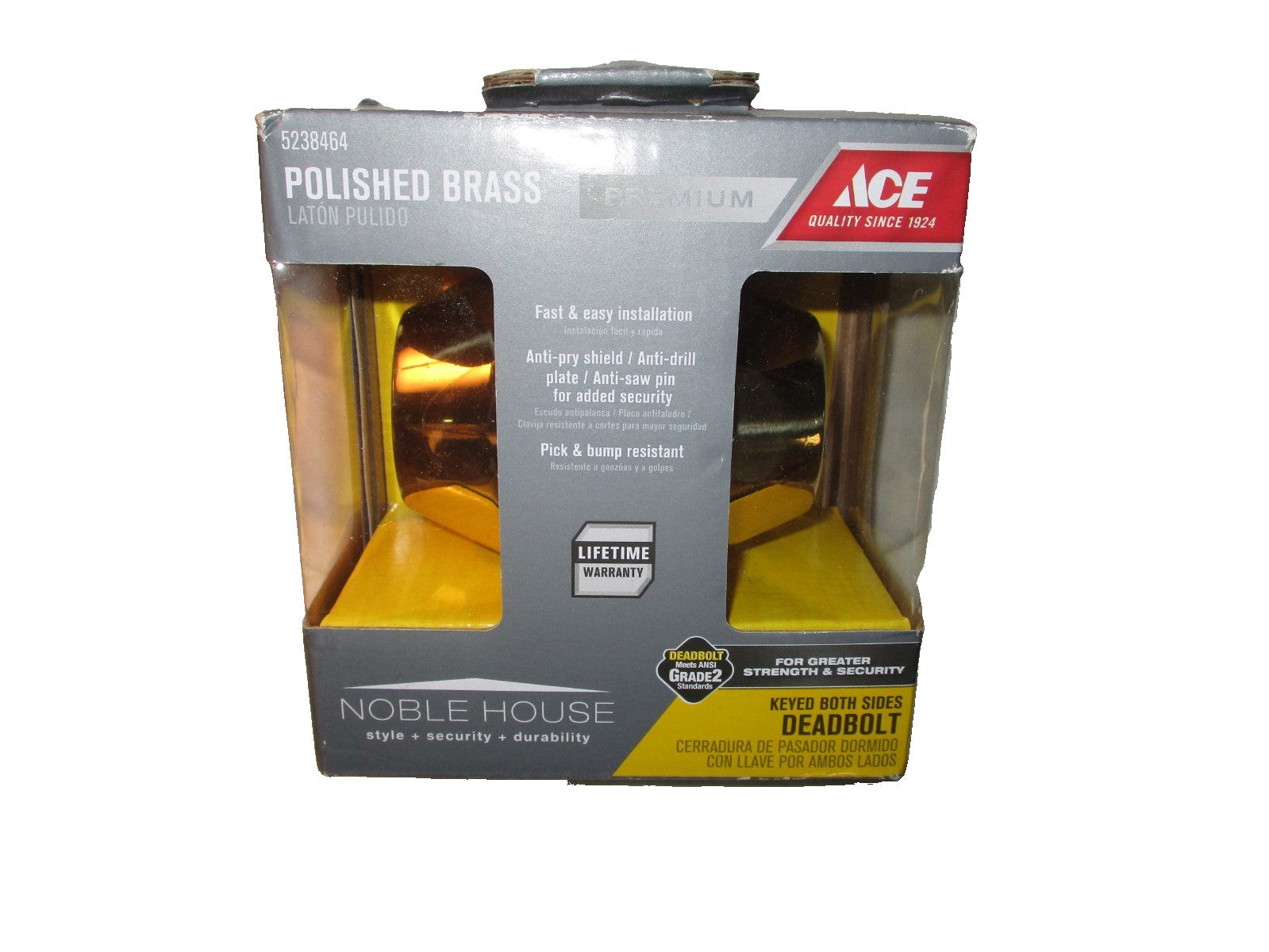 New in the original factory box.ACE Polished Brass Keyed Both Sides Deadbolt 5238464.The ACE Polished Brass Keyed Both Sides Deadbolt 5238464 is a versatile and sturdy door lock mechanism suitable for entry, exterior, and front doors. Made of polished brass, this deadbolt features easy installation and is reversible, making it ideal for universal use. With a single pack including the necessary items, such as a key, this ACE model is a reliable choice for enhancing the security and privacy of your home.