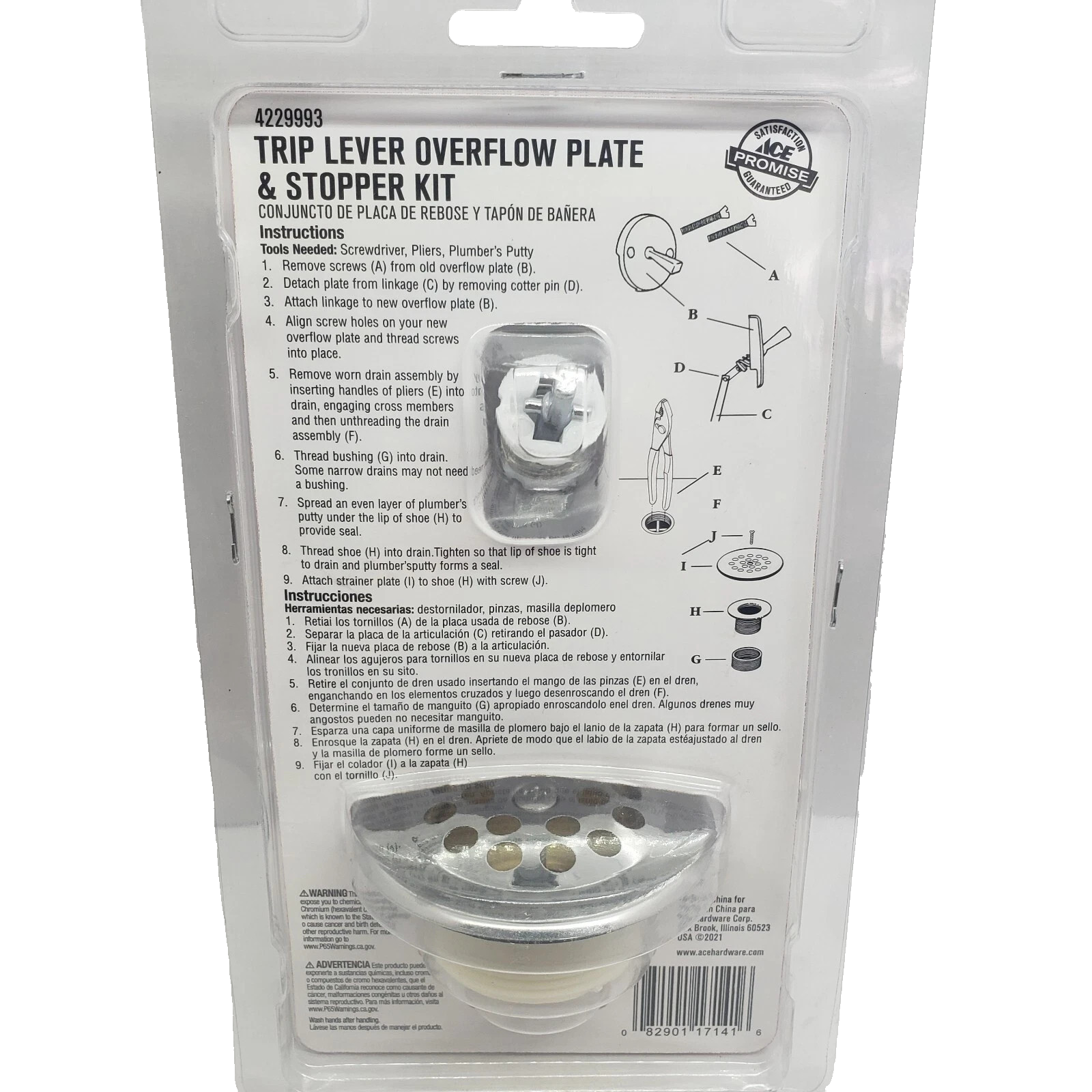 New in the original factory package.ACE Trip Lever Overflow Plate & Stopper Kit Chrome #4229993.The ACE Trip Lever Overflow Plate & Stopper Kit in Chrome is a sleek and modern addition to any bathroom. This round strainer kit features a lever handle for easy operation and is suitable for use in bathtubs. The brushed finish adds a touch of elegance to the overall look, making it a stylish choice for home improvement projects. With the reputable ACE brand and durable chrome material, this kit is sure to provide functionality and aesthetic appeal to your bathroom space.