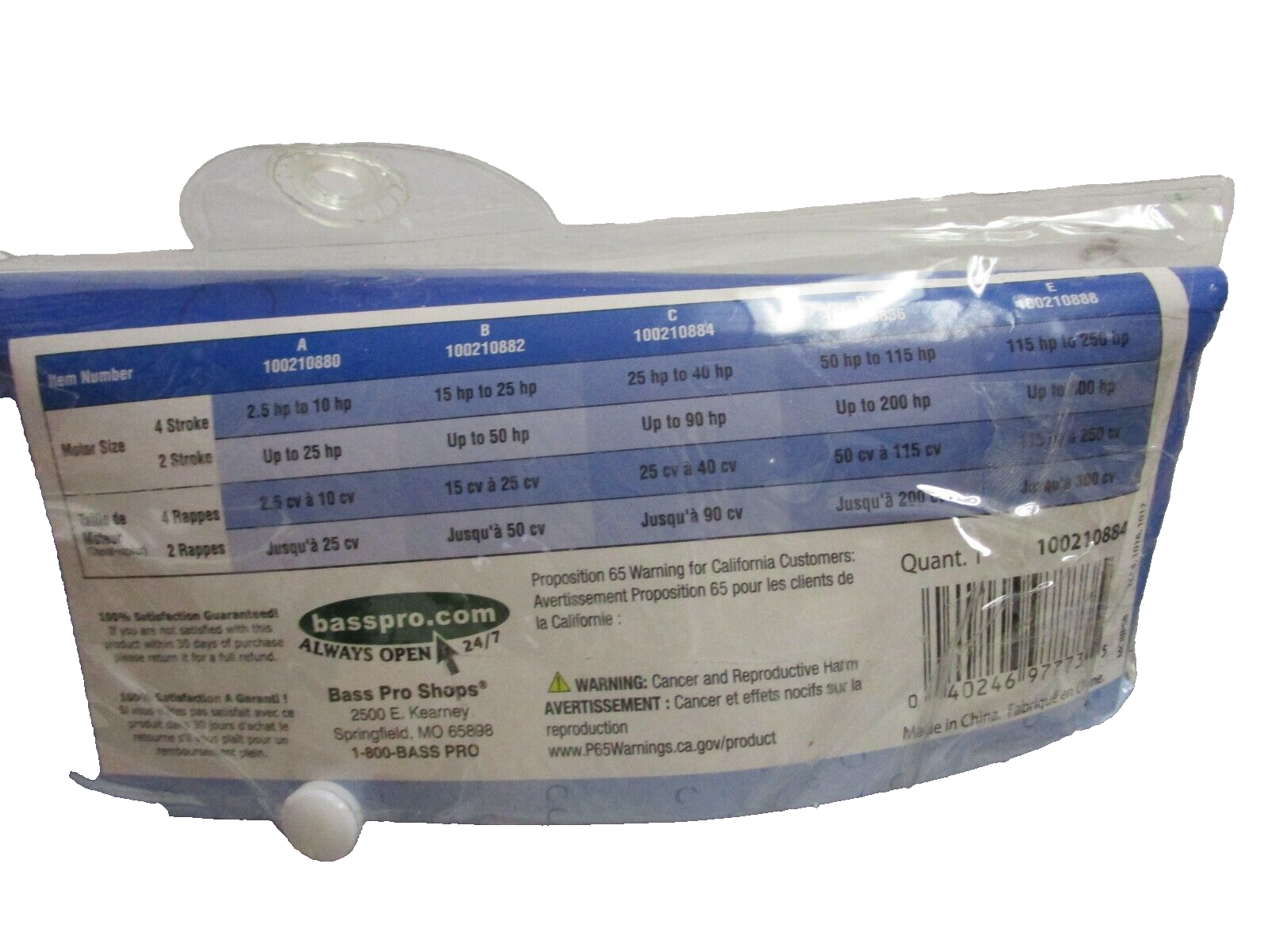 In original factory package. Package was open but did not fit my boat motor so item will be in new condition.The Bass Pro Shop Outdoor World Marine Outboard Motor Covers are durable and reliable accessories designed for boating enthusiasts. Made by the reputable brand Outdoor World Marine, these covers come in a sleek gray color and are specifically designed for models A & C outboard motors. With a manufacturer part number of BC31023BPG and no warranty, these covers are made in China to ensure quality and durability for your boating adventures.