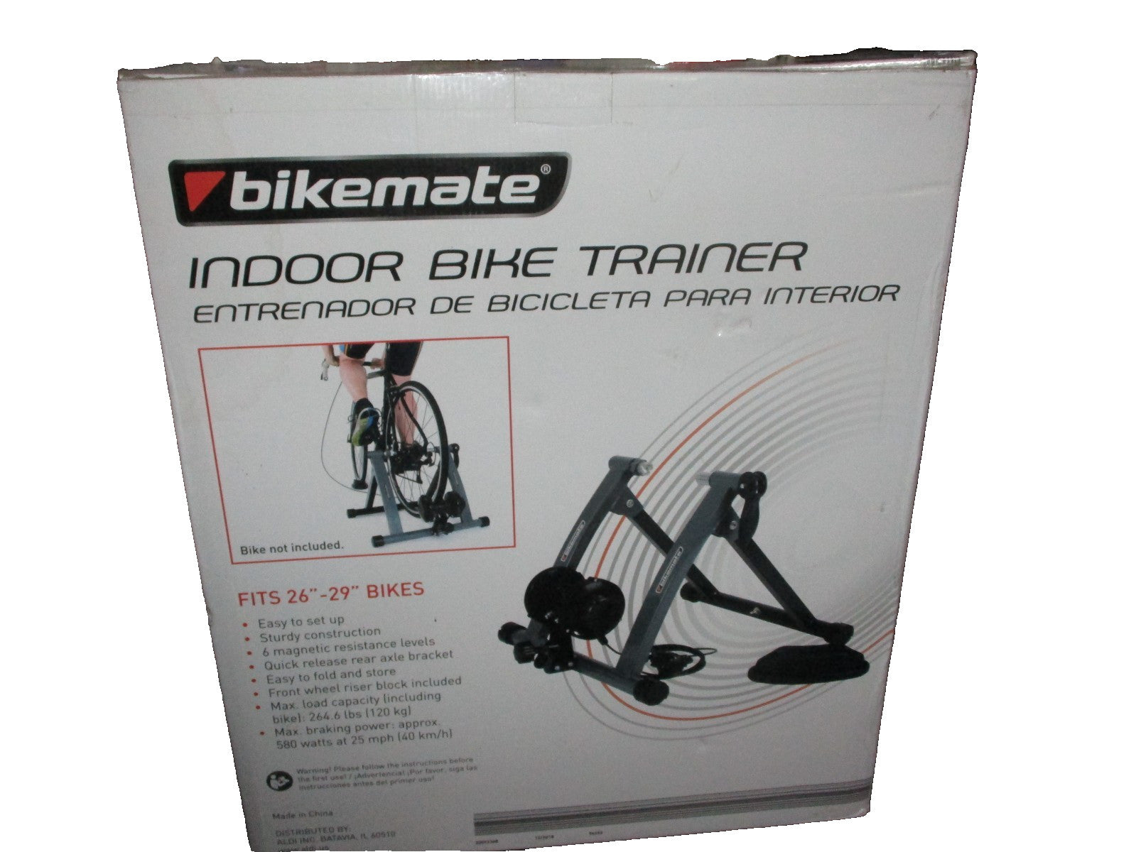 New in the original factory box.BikeMate Indoor Bike Trainer Indoor Bike Trainer Fits 26" to 29" Bikes.The BikeMate Indoor Bike Trainer is a versatile and foldable trainer specifically designed for indoor use with 26" to 29" bikes. It is suitable for adult beginners looking to improve their cycling experience. The sleek gray color and compact design make it easy to store when not in use. This trainer is perfect for those looking to balance their indoor biking sessions and achieve their fitness goals in the comfort of their own home. Designed by the trusted brand Bikemate, this trainer offers stability and convenience for cyclists of all levels.