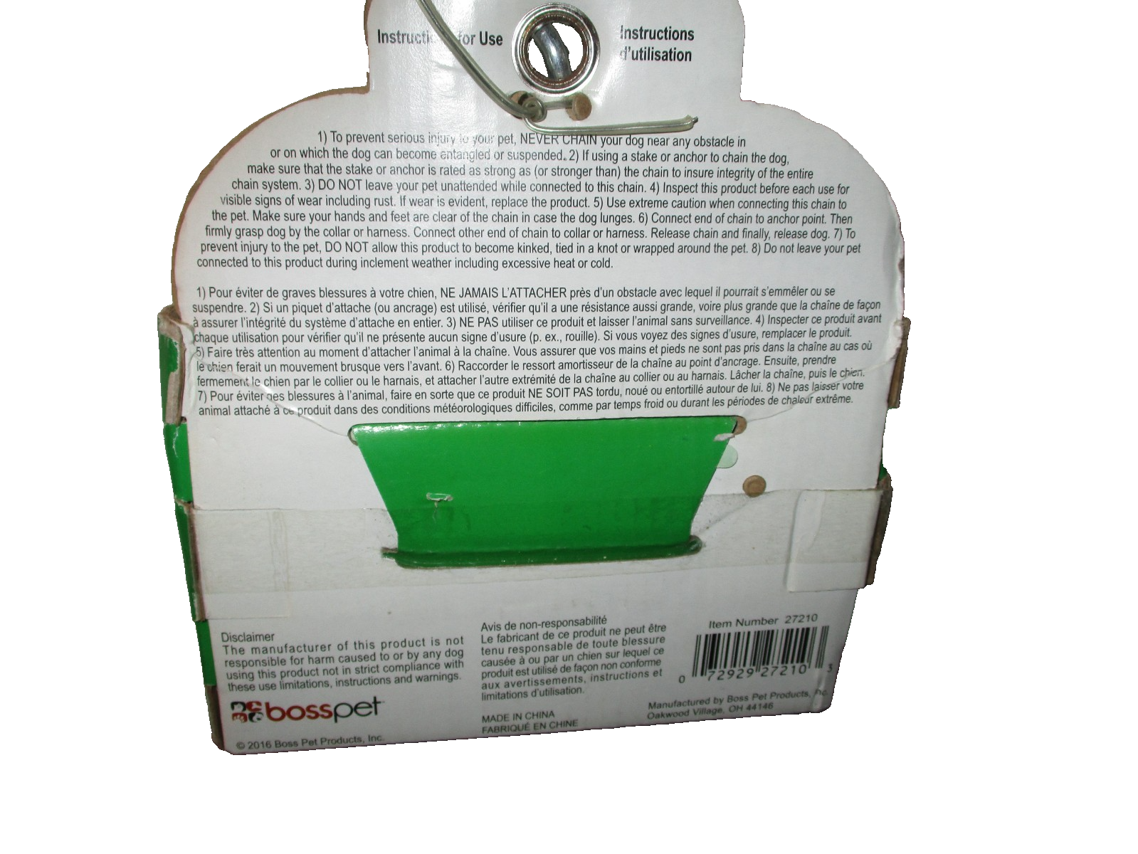 New in original factory box.Bosspet 10' dog tie out Chain Silver Steel Small/Medium Size 35 lbs 27210.The Bosspet 10' Dog Tie Out Chain in silver steel is designed for small to medium-sized dogs weighing up to 35 lbs. Made from durable chain material, this unisex dog chain provides a secure and reliable way to tie out your pet during walks or outdoor activities. The 10-foot length offers plenty of room for your dog to explore and play while maintaining control. With the trusted Bosspet brand, you can feel confident in the quality and strength of this dog tie out chain.