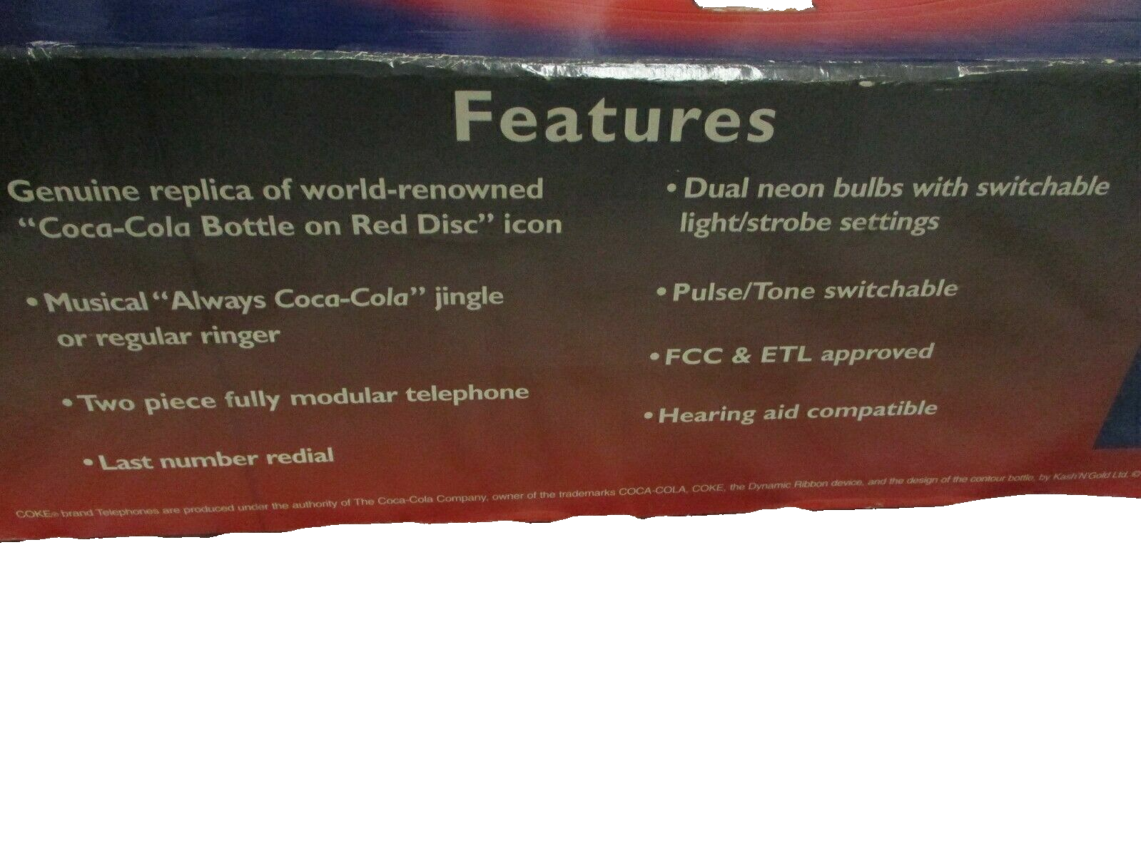 New old stock and in the original factory box.The Coca Cola Blinking Disc Telephone Neon Lights Musical Ringer is a unique collectible item that combines nostalgia with modern technology. With its red color and iconic Coca-Cola branding, it is sure to appeal to fans of the popular soda brand. This item is a rare find as it is classified as new old stock, making it a valuable addition to any Coca-Cola memorabilia collection.1990's