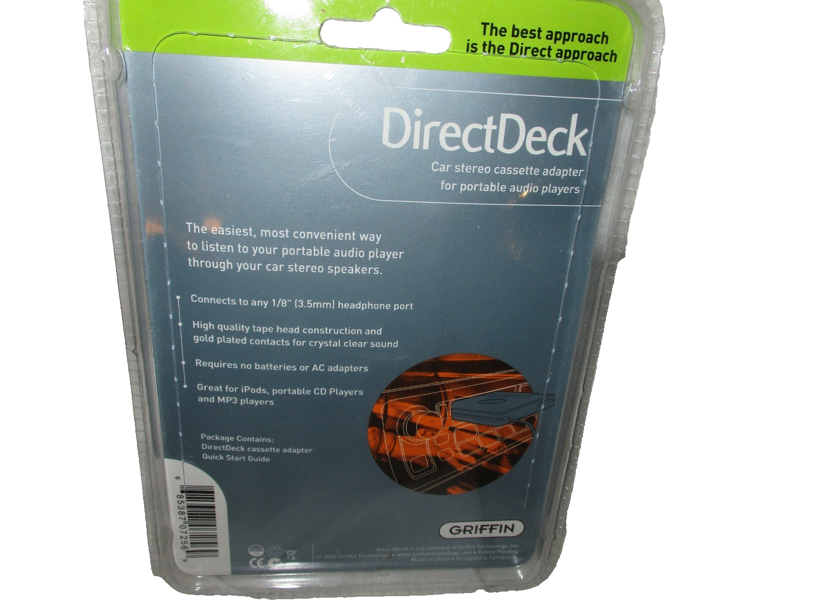 New in original factory package.Direct Deck Car Stereo Cassette Adapter For Portable Audio Players Griffin.The Direct Deck Car Stereo Cassette Adapter by Griffin is a portable audio accessory designed to allow you to connect your portable audio player to a car stereo system that still uses compact/audio cassettes. The adapter is in a sleek black color and is straightforward to use, making it a convenient solution for those who want to enjoy their music on the go but are stuck with a car stereo that only supports cassette tapes. With this Griffin adapter, you can easily convert your digital music into an analog format and enjoy it through your car audio system.