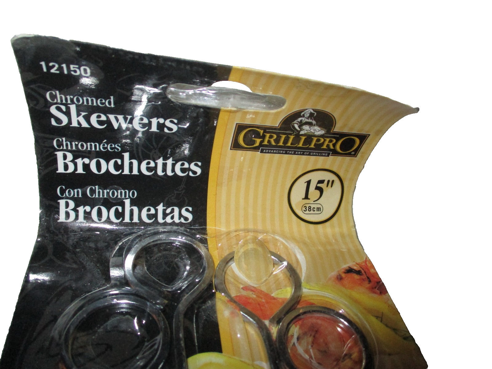 New in original factory package.Grill Mark 12150 Steel Chrome Plated BBQ Skewers 15 L in.The Grill Mark 12150 Steel Chrome Plated BBQ Skewers are a set of 4 stainless steel skewers with a 15-inch length, perfect for grilling various types of meats and vegetables. The chrome finish adds a sleek silver color to the skimmers, making them both functional and visually appealing. These dishwasher-safe skewers are ideal for outdoor cooking and can be easily cleaned for reuse, making them a must-have for any backyard barbeque enthusiast.