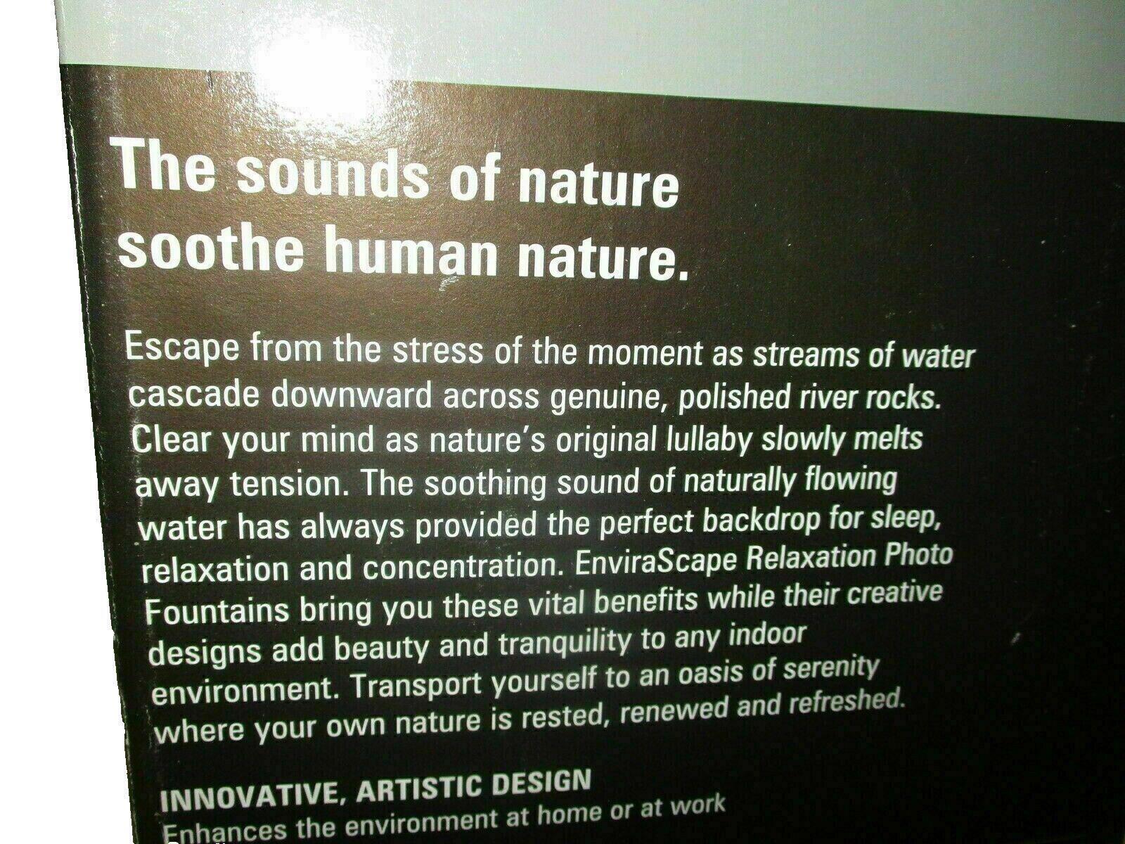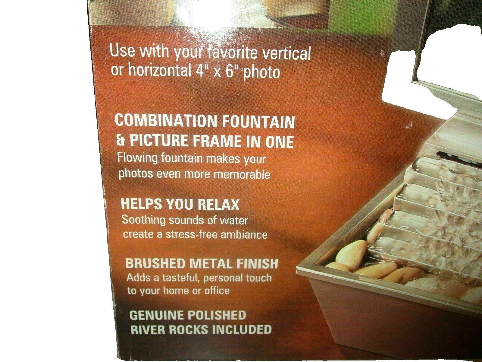 New in original factory box or package.Box or package may not be in the best condition. Have Question Just Ask? Homedics Body Basics Relaxation Photo Fountain Envirascape Celebration. Combination fountain and picture frame, fits a 4 x 6 photo. Customize your frame with hand-crafted magnets, polished river rocks included. Variable flow control pump, durable electric water pump, easy to assemble, convenient table-top size (7 x 5 1/4 x 10). Items in box are in original packaging.The Homedics Envirascape Combination Picture Frame & Relaxation Fountain is a unique decorative collectible that allows you to display your favorite 4"x6" photos while also adding a touch of tranquility to your space with its relaxation fountain feature. This product combines functionality with relaxation, making it a great addition to any home decor setting.