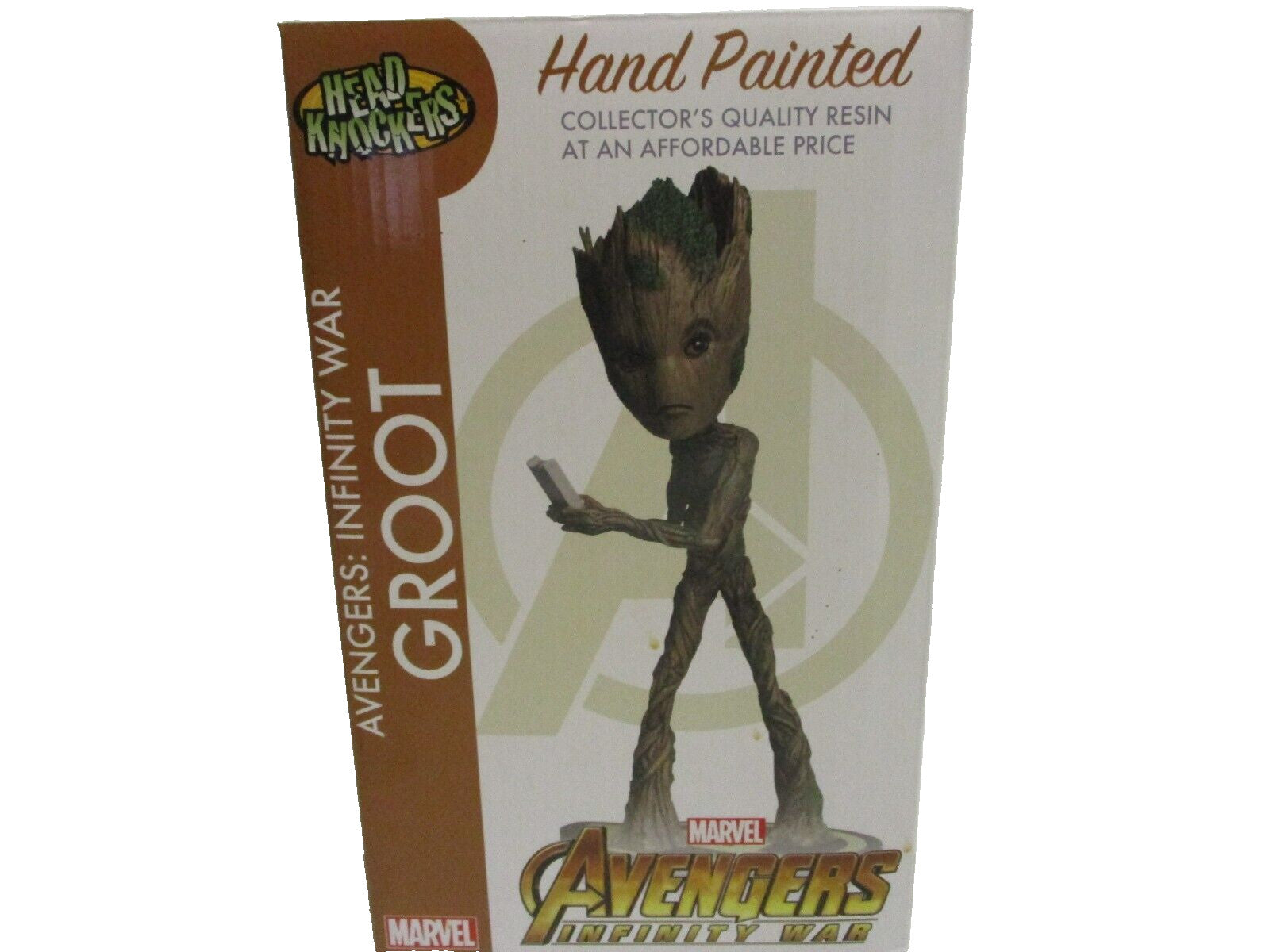 New in the original factory box.Marvel Comics Guardians Galaxy Avengers Infinity War Groot Head Knocker.The Marvel Comics Guardians Galaxy Avengers Infinity War Groot Head Knocker by NECA is a bobblehead collectible featuring the character Groot from the Avengers franchise. Made of resin and weighing 32 ounces, this item is perfect for fans of Groot and Marvel comics. The bobblehead design adds an interactive element to the collectible, making it a fun display piece for any comic book collector's shelf. Without an autograph but with detailed craftsmanship, this Groot head knocker is a must-have for any fan of the Marvel universe.