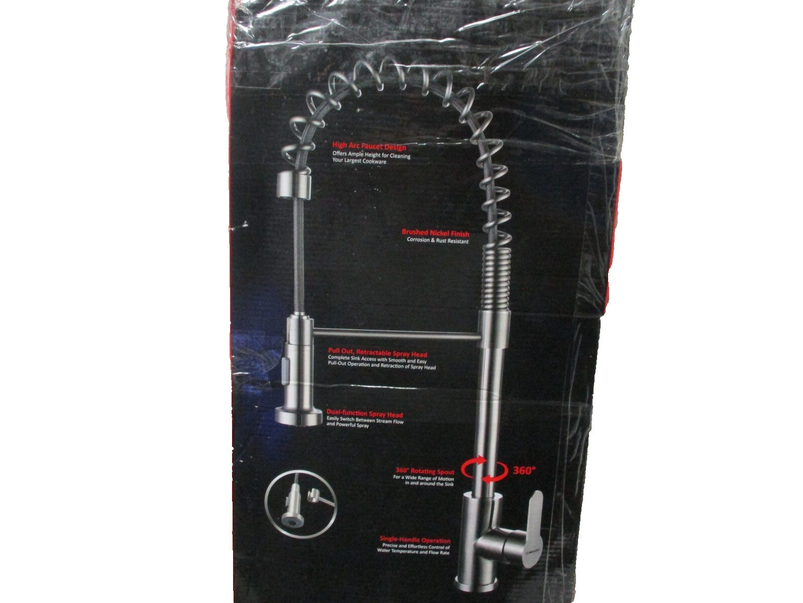 Mueller Austria Professional Werful Sprayer Kitchen Sink Faucet Model KF-900. New in original factory box. Factory box not in the best condition but item will be new inside the box.The Mueller Austria Professional Werful Sprayer Kitchen Sink Faucet is a deck-mounted, pull-out kitchen faucet made of stainless steel with a modern, sleek design. It has a 7.5-inch spout height and comes with a deck for easy installation. The single-hole faucet has a stylish lever handle, suitable for kitchen sinks. Made by Müller in Austria, this kitchen faucet is a high-quality option for your kitchen needs.