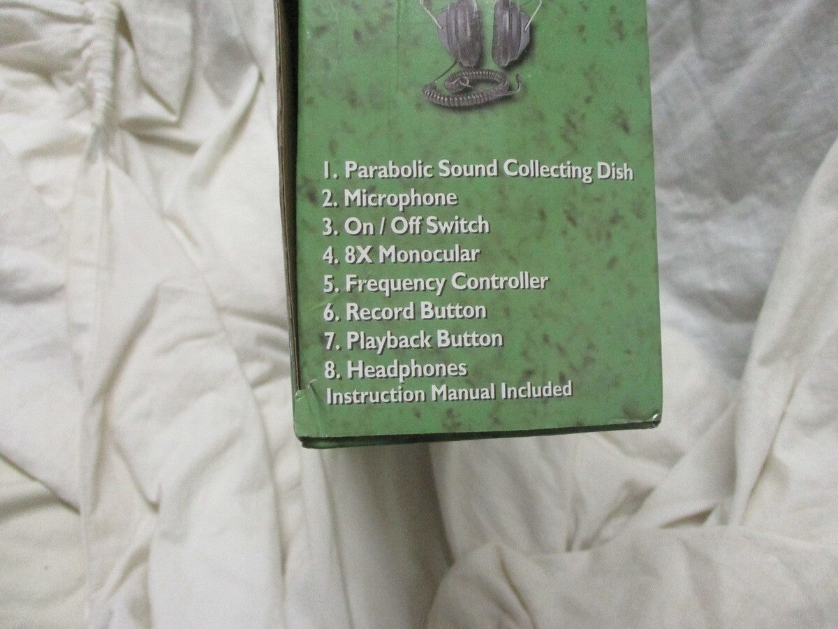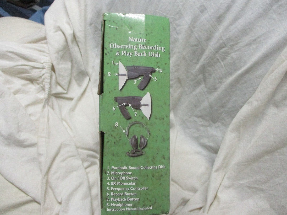 New in original factory box.Nature Observing Recording & Play Back Dish.Observe birds & animals at 8x magnification.Hear sounds over 300 feet away.Digitally records sounds.Playback sounds to transfer them to your tape recorder. The Nature Observing Recording & Play Back Dish is a plastic device used for recording and playback of nature sounds during hunting or outdoor activities. This product allows hunters to discreetly observe and record wildlife without disturbing the natural environment. With its compact and durable design, it serves as a useful tool for those looking to enhance their nature observing experience and make informed decisions while in the field.