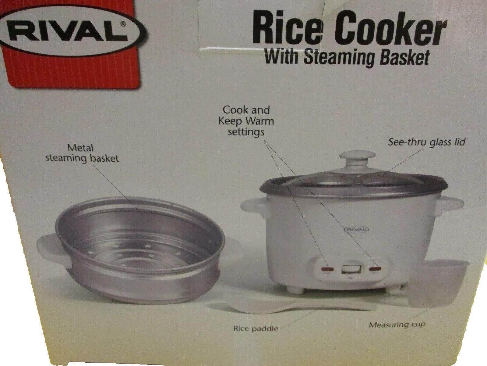 New Old Stock and in original factory box.Rival 8-cup Rice Cooker With Steaming Basket 4350. Includes: Rice Cooker,Steaming Basket,Rice Paddle and Measuring cup. Insructions also included.The Rival 8-cup Rice Cooker with Steaming Basket 4350 is a white rice cooker and steamer designed to efficiently cook and steam up to 8 cups of rice. With convenient components like a lid, measuring cup, inner pot, basket, and spatula, this model offers a hassle-free cooking experience. The steam cooking method ensures evenly cooked rice while keeping the flavors intact, making it a reliable addition to any kitchen for those who appreciate both functionality and style in their small kitchen appliances.
