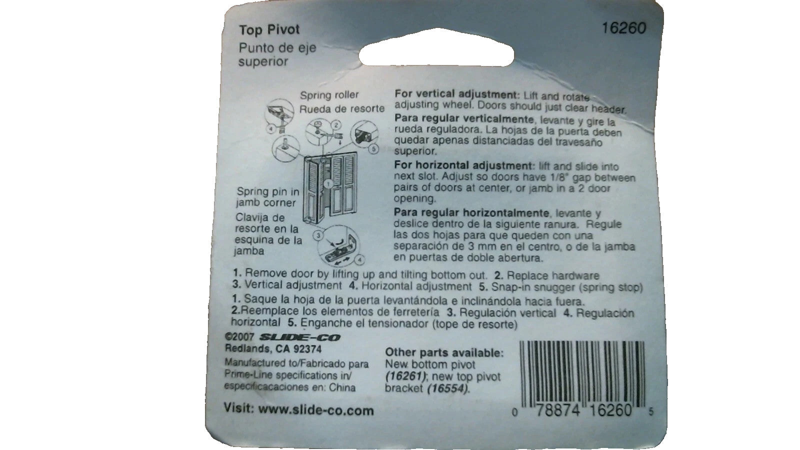 Factory sealed.The Slide-Co 16260 Bi-Fold Closet Door Top Pivot is a hardware component specifically designed for bi-fold closet doors. Made by Slide-Co, this top pivot allows for smooth and easy operation of the door. The model number 16260 signifies the specific design and functionality of this product. Perfect for home improvement projects involving closet doors, this top pivot offers a reliable and durable solution for smooth door movement.