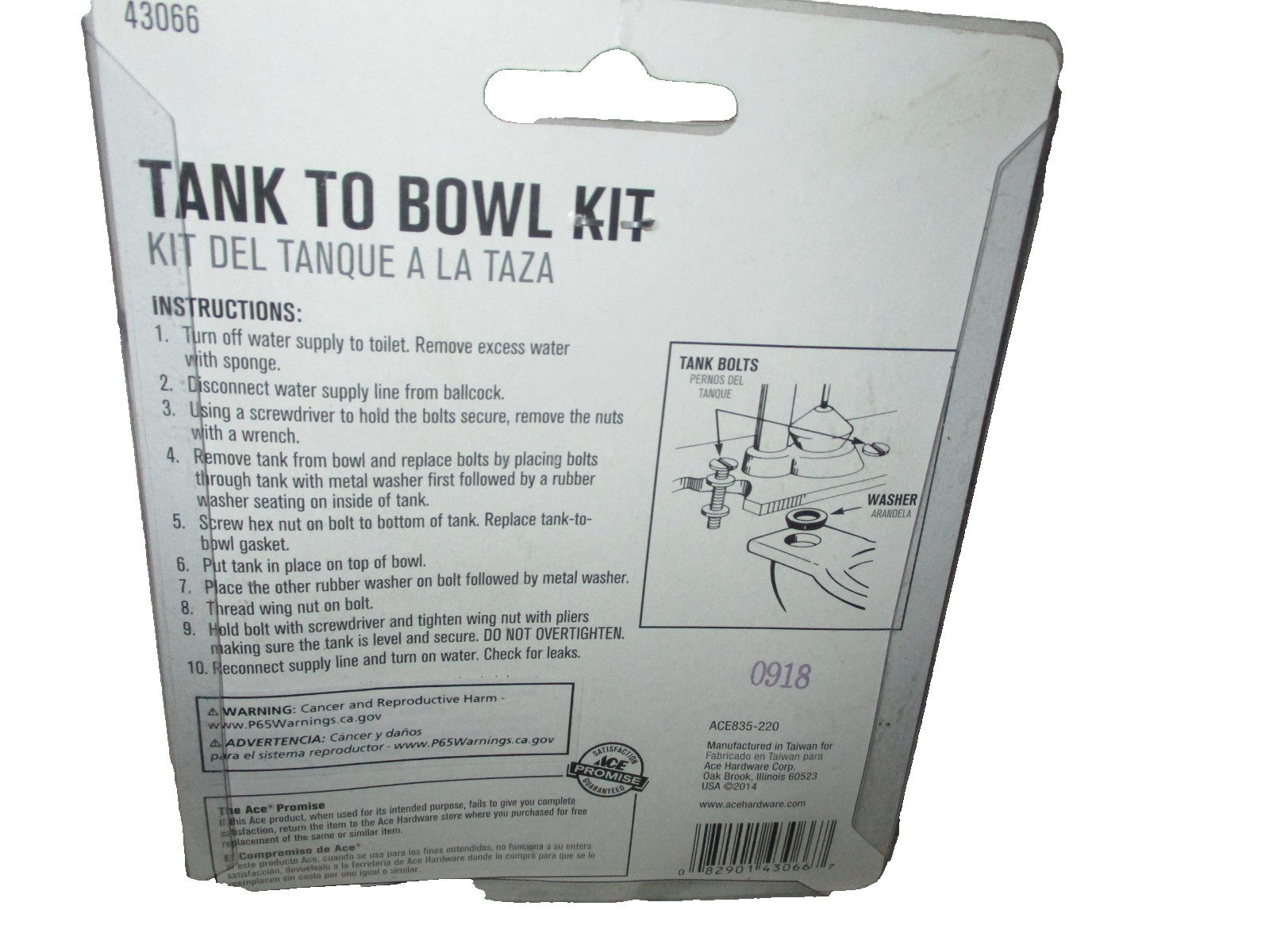 New in the original factory package.Tank To Bowl Kit Beveled Gasket 43066.The Tank To Bowl Kit Beveled Gasket 43066 by ACE is a round-shaped toilet tank gasket designed for standard-sized toilet bowls. Made of brass and rubber in a sleek black color, this kit is suitable for bathrooms and is specifically designed for attaching the tank to the bowl. With its durable materials and precise design, this Tank To Bowl Kit ensures a secure and functional connection for your toilet setup.