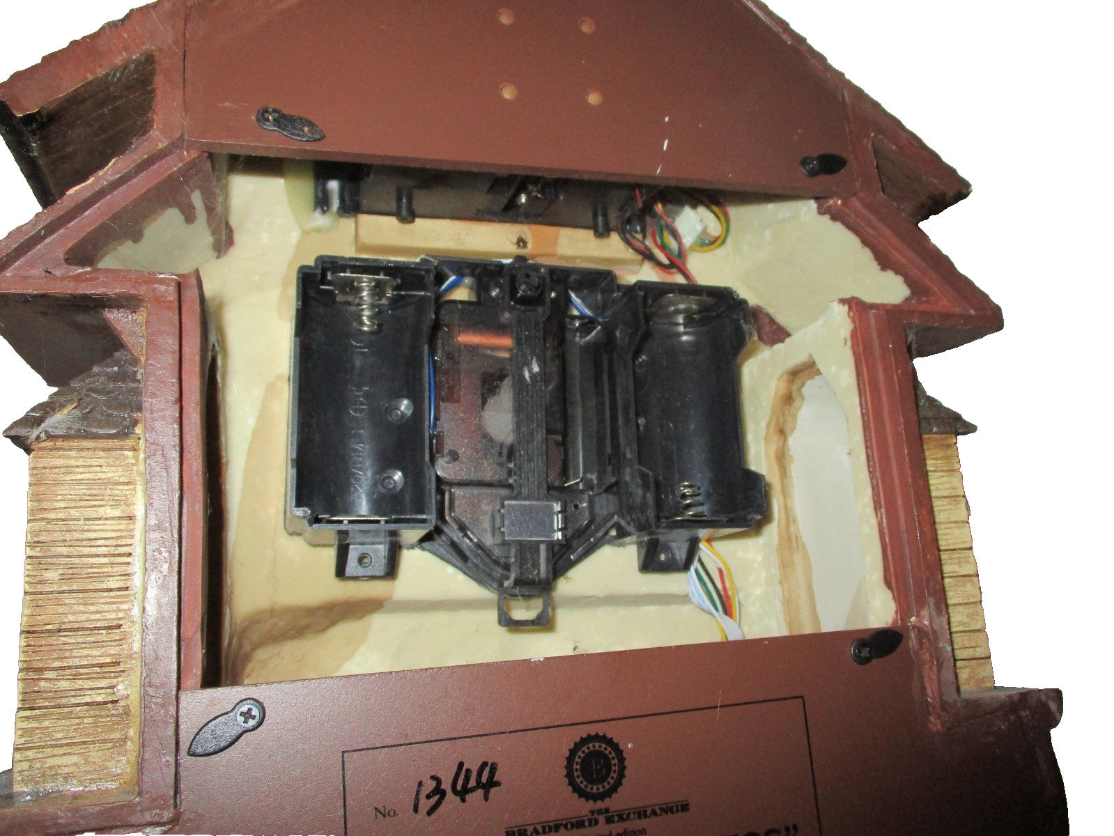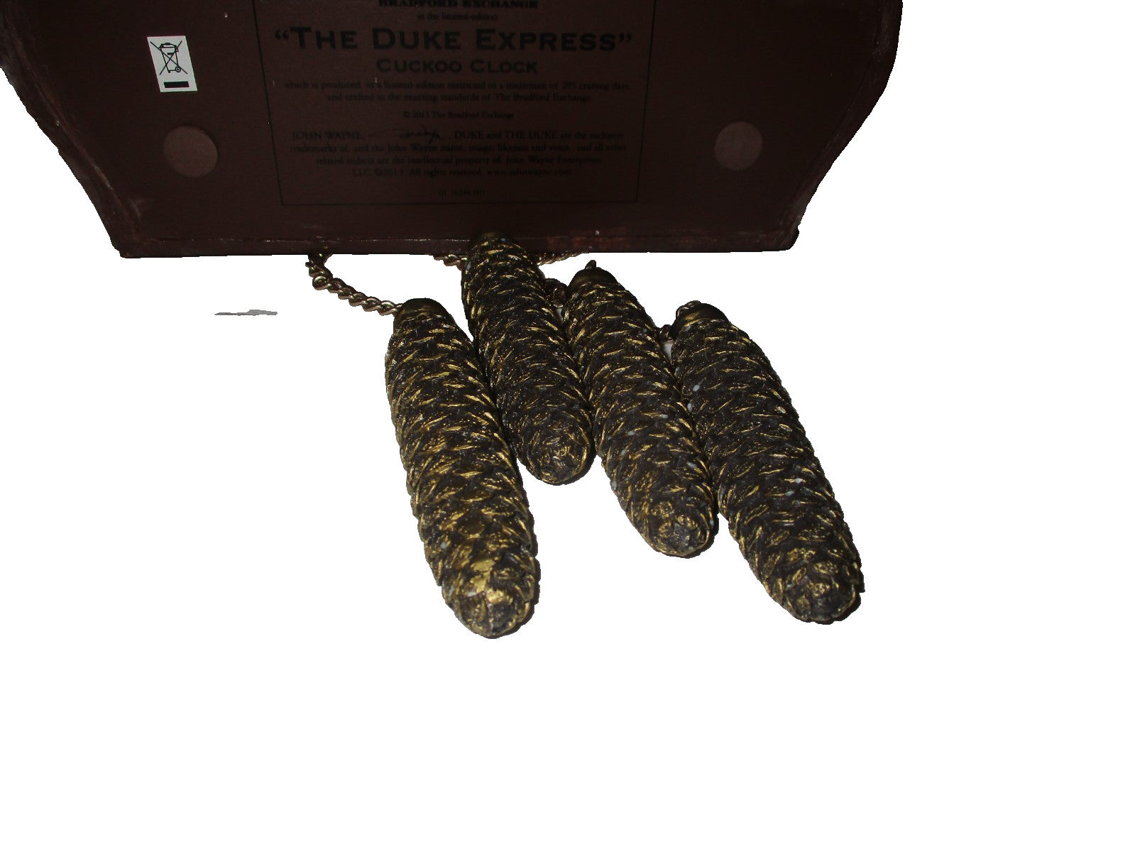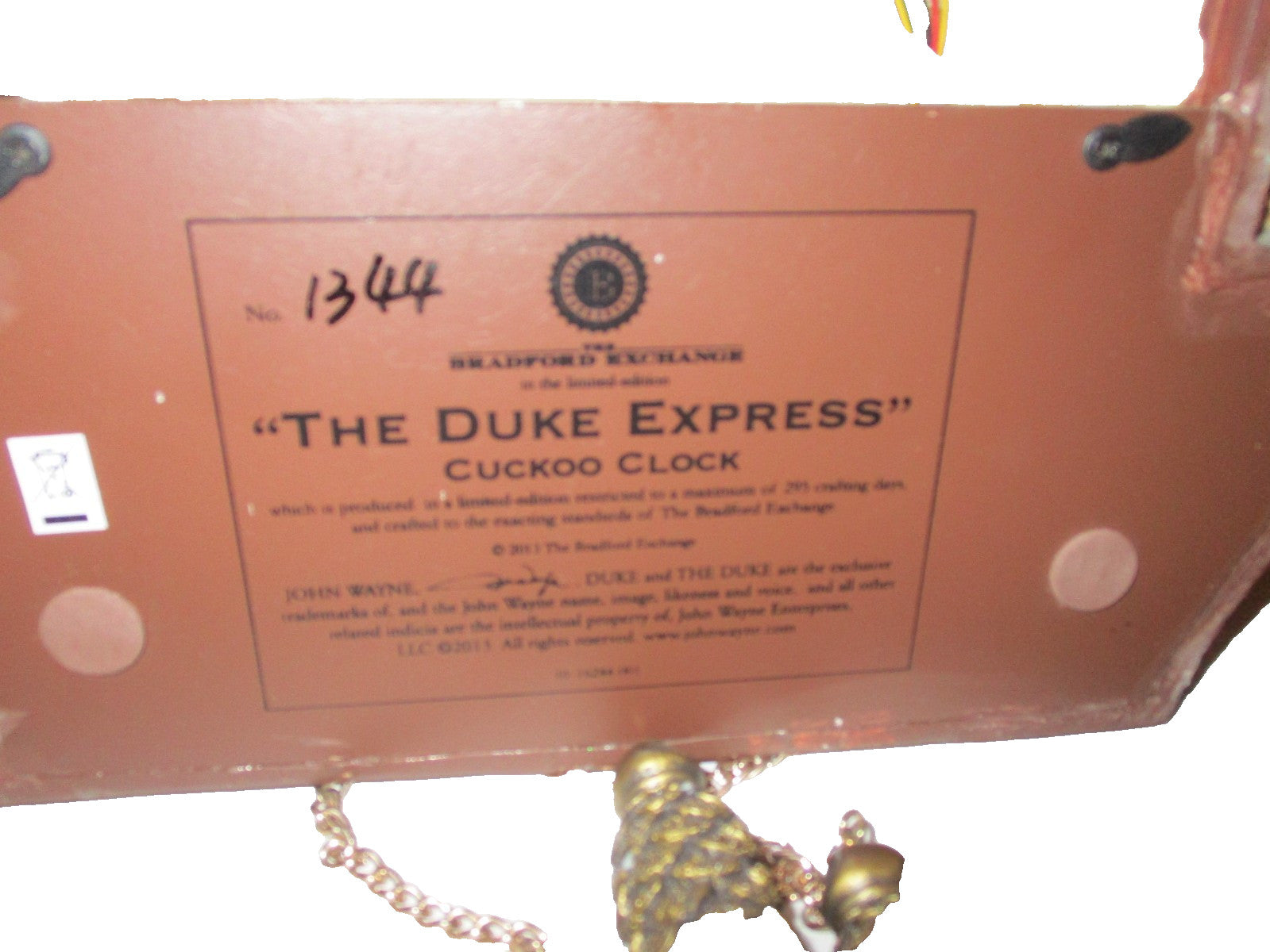 The Duke Cuckoo Clock Bradford Exchange John Wayne HorseBuggy & Train Set Rare Item.The product is a rare and unique Bradford Exchange John Wayne HorseBuggy and Train Set Cuckoo Clock. This modern style clock features a quartz movement and is powered by batteries. The clock is beautifully crafted with a brown wood frame, displaying an analog display. With its vintage charm and musical features, this 2013 era clock is a perfect addition to any living room or collector's display.Battery cover missing.Tested and still works.Battery Operated.