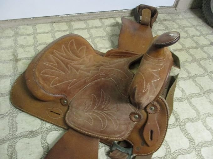Complete vintage horse saddle. Will look used. Complete full size leather saddle. Will look used. In very good condition.The product is a traditional tooled leather Western ranch roping horse saddle in brown color, designed for outdoor sports and equestrian activities. Made in India, this saddle is crafted from high-quality leather and comes in sizes ranging from 15 to 17 inches. With a classic design and durable material, this saddle is perfect for horse riders who require a comfortable and reliable saddle for roping and other riding tasks. It offers both style and functionality for a rugged outdoor experience.