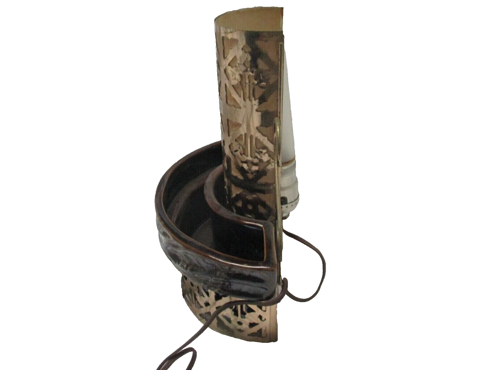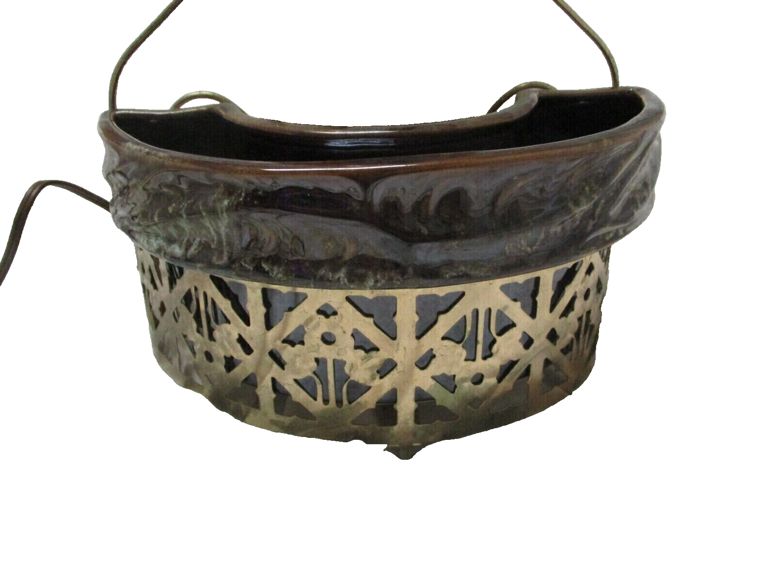In very good condition but will still have monor scratches on item and look aged. A textured brown pottery planter with green accents and gold tone metal frame. There are age spots on the gold tone metal but it adds to the vintage charm. I think it would make a great desk lamp. I think it is a Sierra-Columbia lamp.