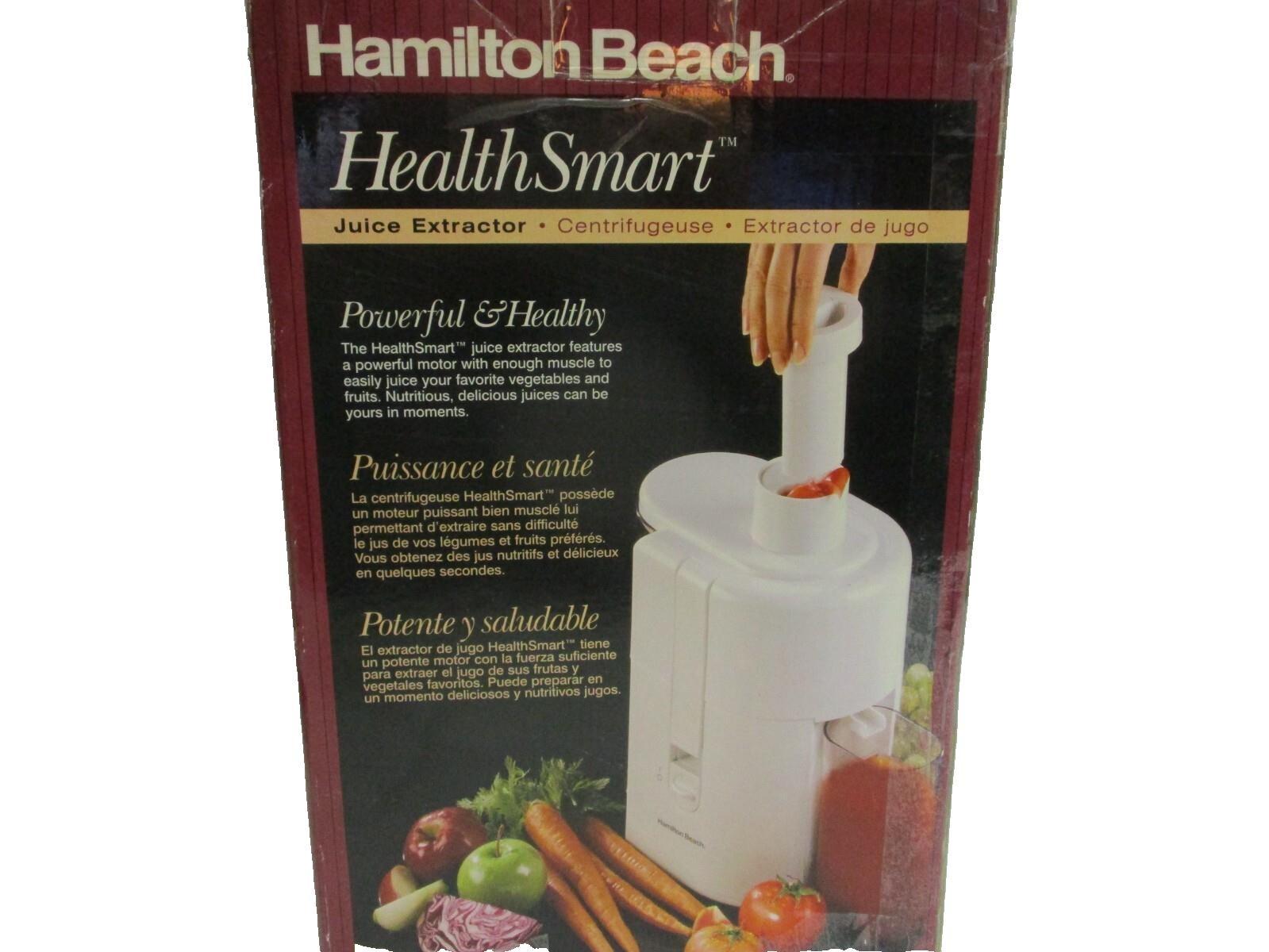 New old stock and in the original factory box.Vintage Hamilton Beach Juice Extractor Model 67150 Health Smart.The Vintage Hamilton Beach Juice Extractor Model 67150 Health Smart is a white electric centrifugal juicer with a stainless steel material. It has a 200W power and a 20 oz capacity, making it suitable for extracting juice from fruits and vegetables. This appliance is Energy Star compliant. It includes components such as a blender, top/lid, and unit, providing everything needed to make healthy juices at home.The Vintage Hamilton Beach Juice Extractor Model 67150 Health Smart is a white electric juicer made of stainless steel. With a capacity of 20 oz, this centrifugal juicer is Energy Star compliant and includes a blender, top/lid, and unit components. Manufactured by Hamilton Beach, 200 W power source to efficiently extract juice from fruits and vegetables. Perfect for home use, this juicer adds a healthy touch to any kitchen with its convenient features and classic design.