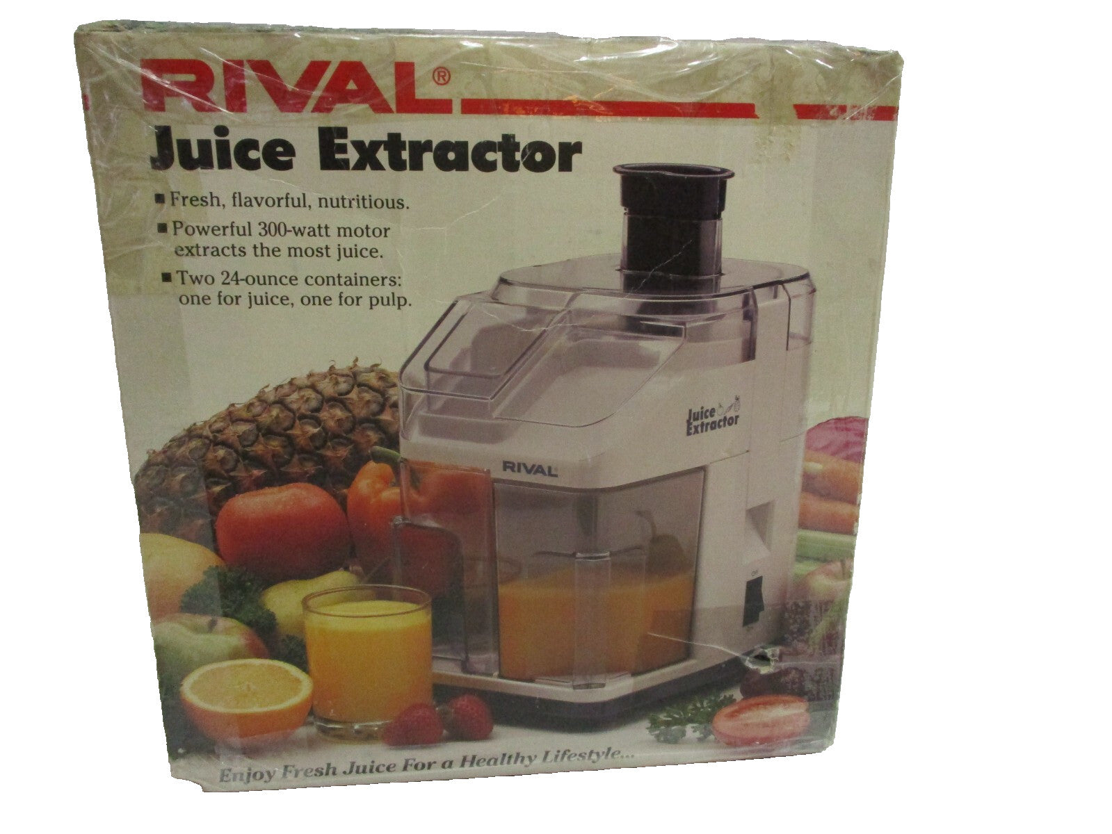 New old stock and in the original factory box.Factory box will not be in the best shape but item inside box will be in new condition.Vintage Rival Electric Juice Vegetable Extractor Model 965 White Kitchen.The Vintage Rival Electric Juice Vegetable Extractor Model 965 is a white kitchen appliance designed for juicing citrus fruits, vegetables, berries, and making sauces and blends. With a capacity of 24 oz and a power of 300 W, this electric juicer features a glossy finish and is made of ABS plastic. It includes components such as a funnel, container, lid, blender, mixer, basket, and grinder, making it easy to extract juice from various ingredients. The detachable parts and large feeding tube add convenience to the juicing process, while the simple design with one speed setting ensures easy operation for home use.